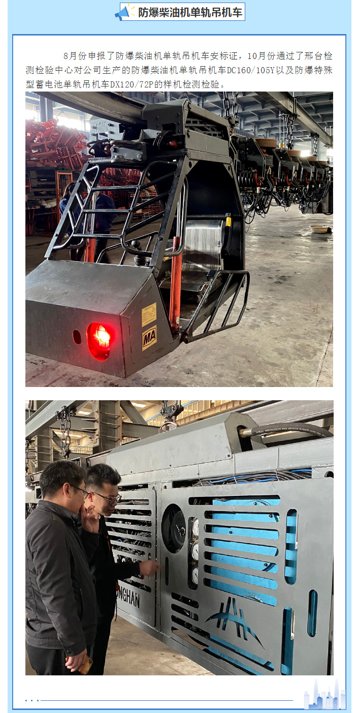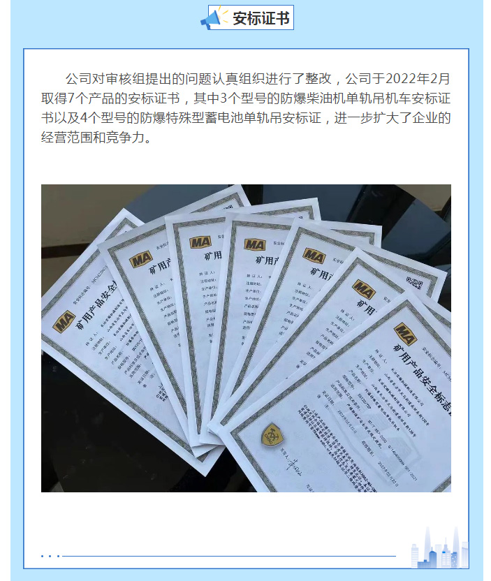 賀:長(zhǎng)治宏瀚機(jī)械有限公司取得7個(gè)單軌吊機(jī)車(chē)產(chǎn)品的安標(biāo)證書(shū)